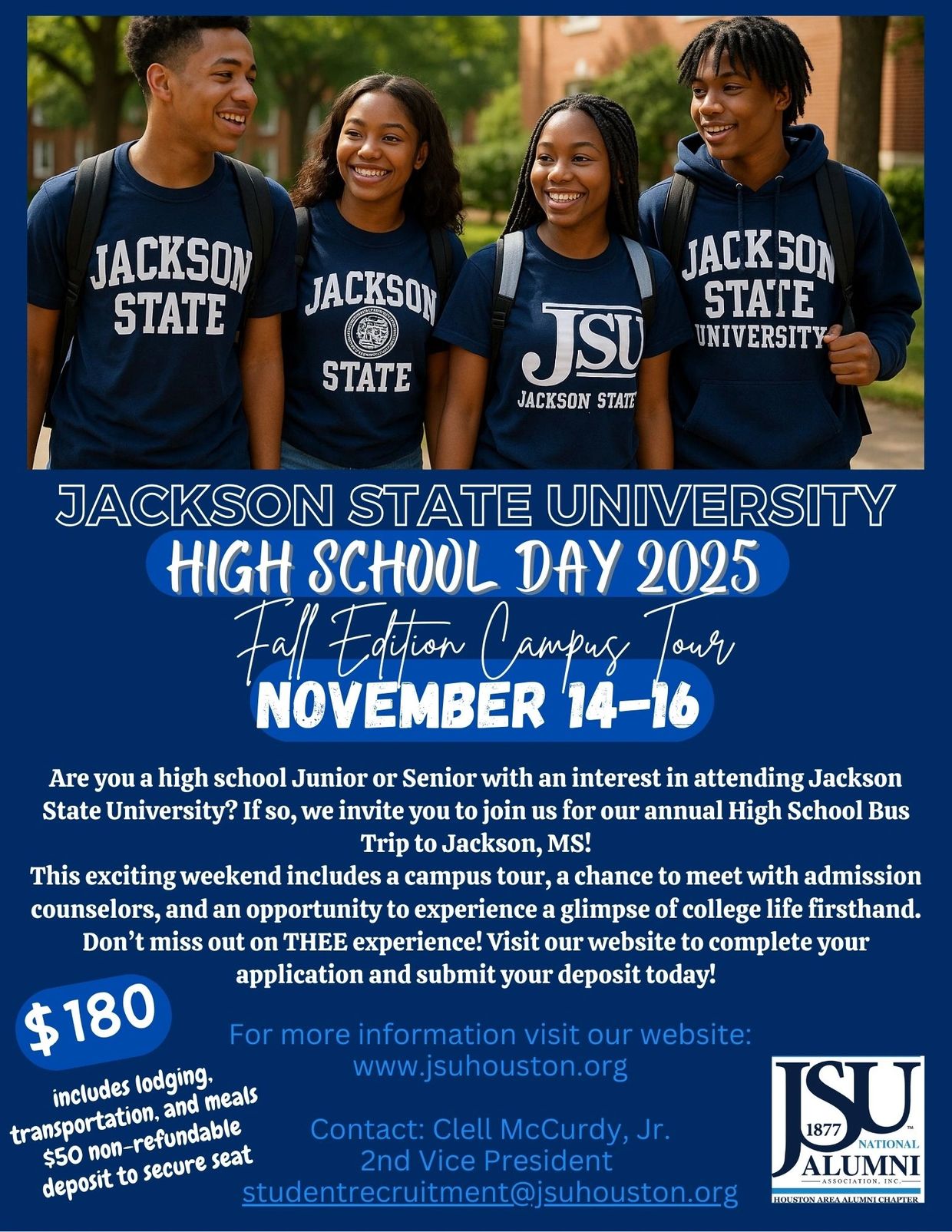 Are you a high school Junior or Senior with an interest in attending Jackson State University? If so, we invite you to join us for our annual High School Bus Trip to Jackson, MS! This exciting weekend includes a campus tour, a chance to meet with admission counselors, and an opportunity to experience a glimpse of college life firsthand. Don't miss out on THEE experience! Complete your application and submit your deposit today!
